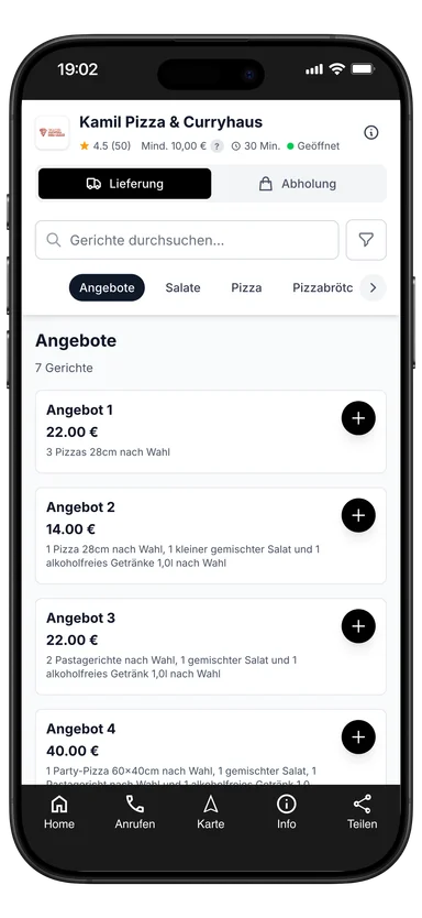 1 Familienpizza 46x33cm nach Wahl, 1 gemischter Salat, 1 Pastagericht nach Wahl und 1 alkoholfreies Getränk 1,0l nach Wahl